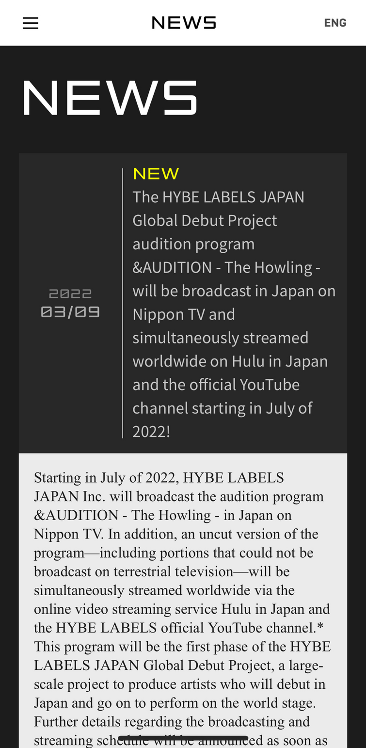 &AUDITION - The Howling A global boy group audition program of the HYBE LABELS JAPAN Global Debut Project. Starting in July 2022, the program will be broadcasted in Japan on Nippon TV and simultaneously streamed worldwide on Hulu in Japan and the HYBE LABELS official YouTube channel.